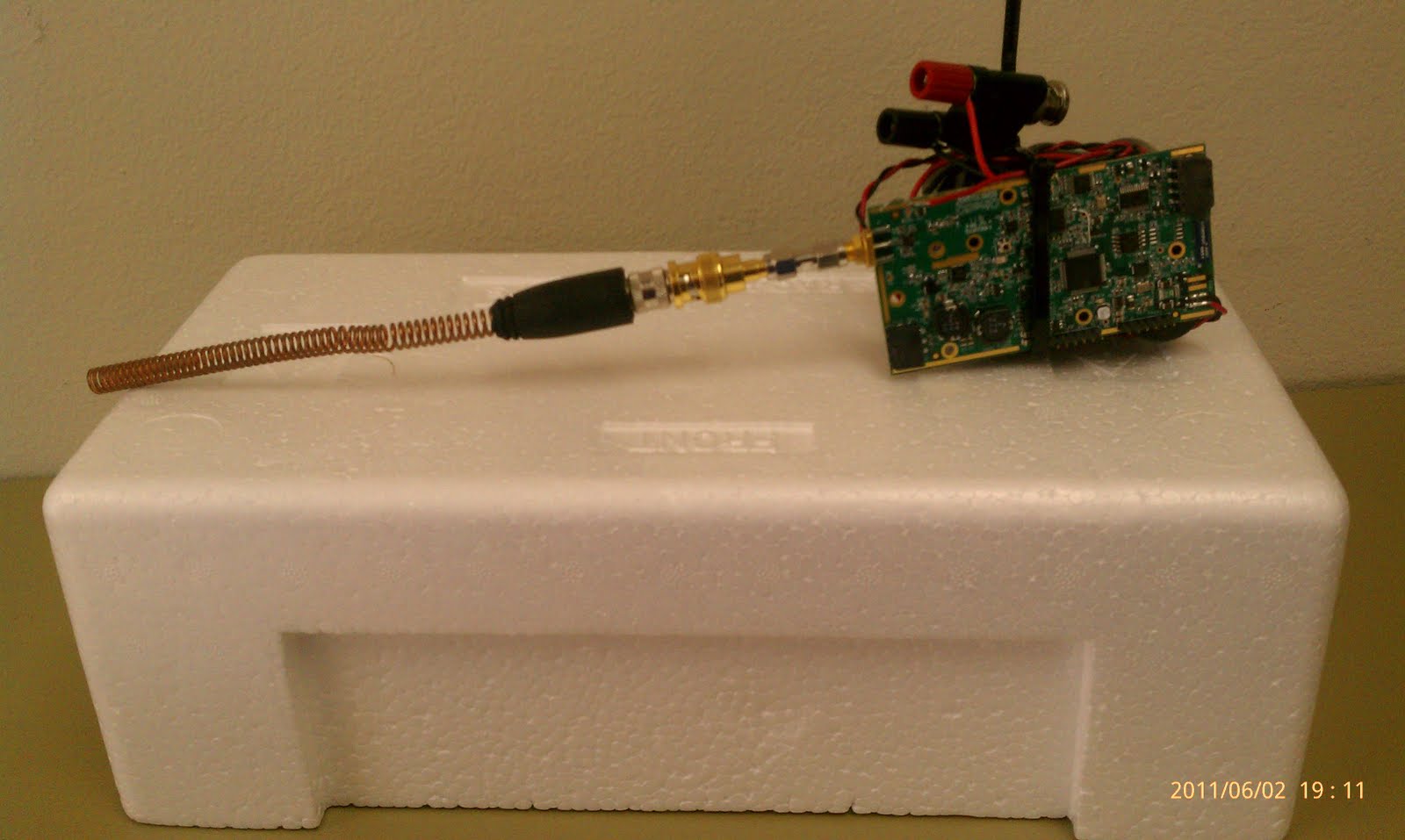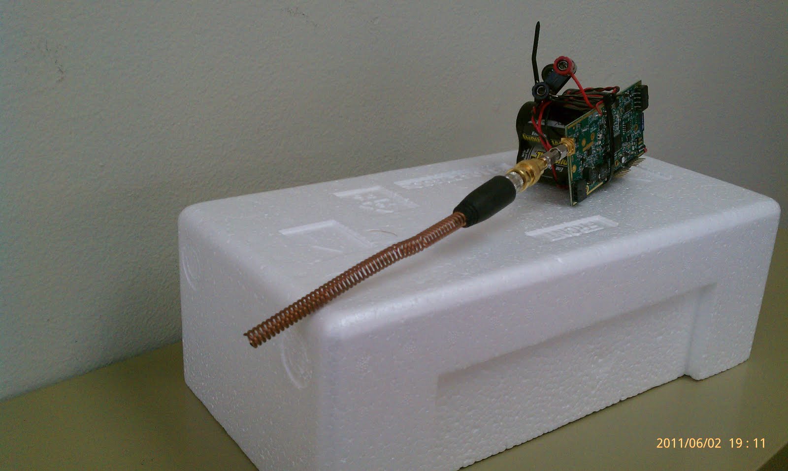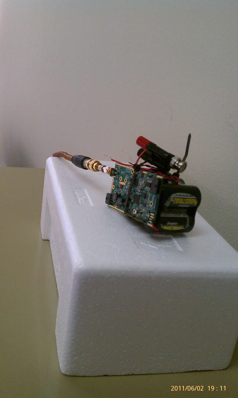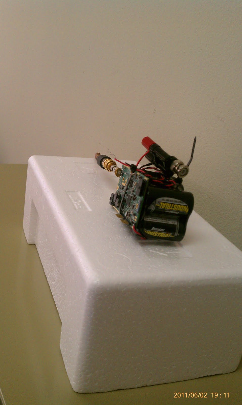This system had 6 batteries, a circuit board, and a small antenna. There are some wires going to the battery pack. This system is a prized system, worth several tens of thousand of dollars in development, so he had gently placed the unit on small Styrofoam base he had found in the shopping and receiving department. This kept the unit off the ground and he felt this was a smart idea (it was) as the road was not used at all and very dirty. The Styrofoam base was about the size of a shoe box. We used the base because the mechanical housings are not yet ready.